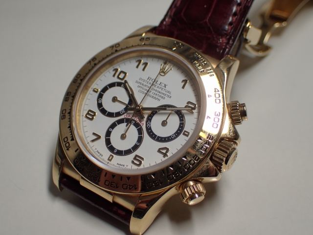 | 本日はROLEX DAYTONA【Ref.16518】をご紹介いたします。1991年から2000年まで生産されていたデイトナ初のレザーベルト仕様×18KYGモデルとなります。同時期に生産されていたブレスタイプの18KYGモデル【Ref.16528】には作られていないアラビア数字のインデックスとなっており、お洒落な印象です。BOXはございませんが、保証書と冊子一式が揃っている素晴らしいお品です。レザーのコンディションも良く、大きな凹みなどもございません。お電話やメールにて【試着予約】も承っておりますので、気になられている方やご検討中の方は是非お気軽にクォーク銀座888店までお問い合わせ下さいませ。 | ||
