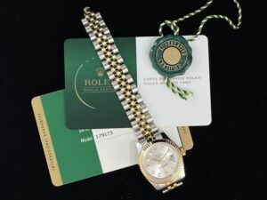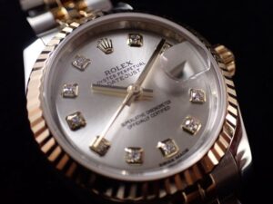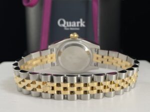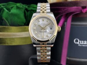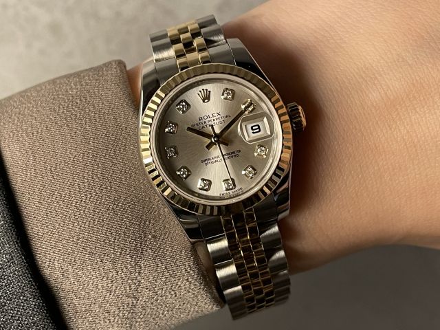 本日はROLEX DATEJUST【Ref.179173G】をご紹介いたします。こちらは、2003年から2016年まで製造されていたレディースモデルのデイトジャスト。美しいシルバーダイアルに、10ポイントのダイヤモンドインデックスが贅沢にあしらわれており、上品さの中に華やかさも兼ね備えた一本です。ケースとブレスレットには、18Kイエローゴールドとステンレススチールのコンビネーションを採用し、高級感と耐久性を見事に両立。現行モデル(28mm)よりやや小ぶりな26mmケースは、女性の腕元に自然にフィットし、普段使いはもちろん、フォーマルな場面でも活躍してくれます。また、こちらの個体は日本ロレックスにてオーバーホールを実施済み。使用感も少なく、非常に良好なコンディションを保っておりますので、安心してご使用いただけます。お電話やメールにて【試着予約】も承っておりますので、気になられている方やご検討中の方は、是非お気軽にクォーク銀座店までお問い合わせ下さいませ。 | ||