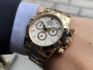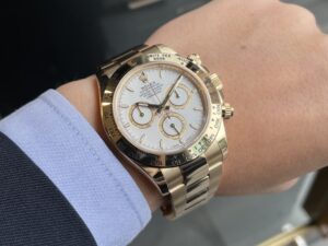 本日はROLEX DAYTONA【Ref.126508】をご紹介いたします。こちらは2023年に発表された現行モデル。新たに搭載されたCal.4131は2万8800振動/時で作動し、72時間のパワーリザーブを備えます。前モデルのCal.4130よりも部品点数が少ない一方で、仕上げはより洗練されております。最大の特徴は40mmのフルイエローゴールドケース。豪華ではありながら、洗練された大人の魅力を引き立て、清潔感のある白文字盤の爽やかな印象も加わっております。こちらの個体は2024年製で抜群に綺麗なコンディションを保っております。お電話やメールにて【試着予約】も承っておりますので、気になられている方やご検討中の方は、是非お気軽にクォーク銀座店までお問い合わせ下さいませ。