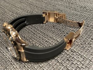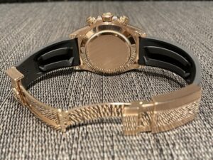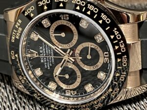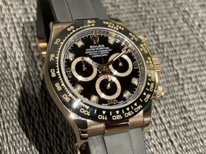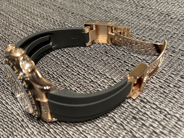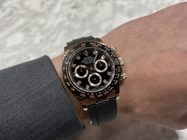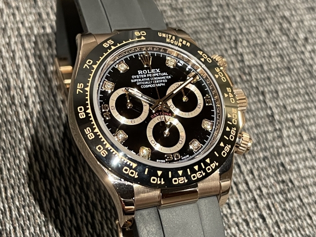 本日はROLEX 【Ref.11615LNG】をご紹介いたします。ブラック文字盤の統一感あるカラーリングの中に、エバーローズゴールドの優しい輝きと、ラバーベルトが個性を魅せるモデルとなっております。クロノグラフ機構が搭載されているにも関わらず、程よい40mmのケースサイズに収まっているのもDAYTONAの凄さの1つではないでしょうか。2025年6月にオーバーホールも施されておりコンディションも良好な1本です。お電話やメールにて【試着予約】も承っておりますので、気になられている方やご検討中の方は、是非お気軽にクォーク銀座店までお問合せ下さいませ。