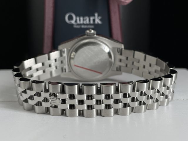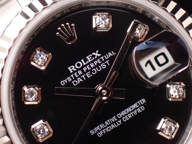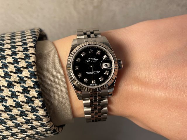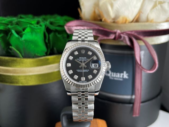 本日は ROLEX DATEJUST【Ref.179174G】をご紹介いたします。こちらは、2005年から2016年前後まで製造されていた 26mmのレディースモデルでございます。シックなブラックダイヤルに10Pダイヤが上品に輝き、非常に高級感のある一本です。レディースモデルのブラック文字盤は、現行の28mm DATEJUST Ref.279174Gでは展開がなく、市場での流通量も少なくなっているため、入荷の希少な文字盤カラーとなっております。今回ご紹介の個体は 2016年製。使用感も少なく、非常に良好なコンディションを保っております。お電話やメールにて【試着予約】も承っておりますので、気になられている方やご検討中の方は、是非お気軽にクォーク銀座店までお問い合わせ下さいませ。