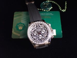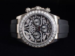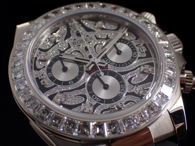 本日は ROLEX DAYTONA【Ref.116589TBR】をご紹介いたします。18Kホワイトゴールドケースに、36個のバケットダイヤモンドを配したベゼルを組み合わせた、非常にラグジュアリーな外装が特徴のモデルです。通称「ホワイトタイガー」と呼ばれるトラの模様にも見える立体的かつ独特のコントラストが非常に魅力的で迫力があり、通常のデイトナとは一線を画す特別な表情を演出しています。2021年に登場したシークレットモデルとして流通量は極めて少なく、市場に出回る機会も限られている希少な一本です。2021年製の個体となるため、コンディションも良好な状態を保っております。お電話やメールにて【試着予約】も承っておりますので、気になられている方やご検討中の方は、是非お気軽にクォーク銀座店までお問い合わせ下さいませ。 |