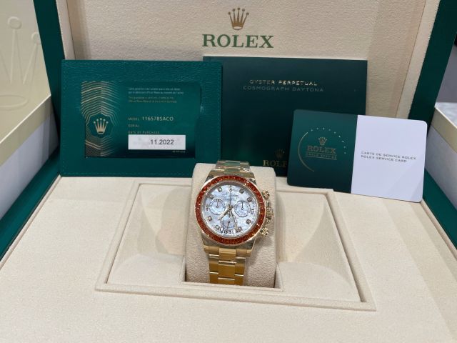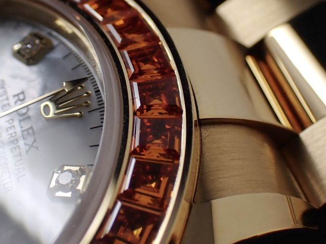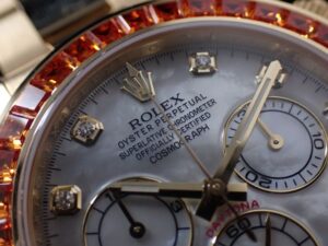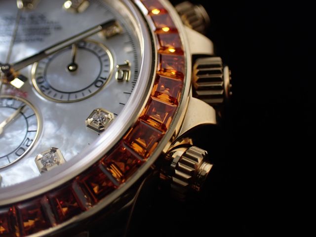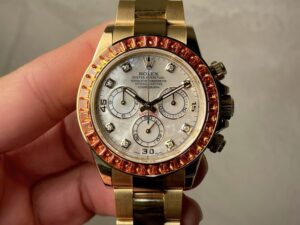 本日は、数あるロレックスの中でも別格の存在感を放つ2019年に発表されたDAYTONA【Ref.116578SACO】をご紹介いたします。文字盤には、ダイヤモンドインデックスをあしらった艶やかなマザーオブパールを配し、ラグジュアリーと気品を兼ね備えた唯一無二の表情を演出しています。最大の特徴は、ベゼルに贅沢にセッティングされた36個のバゲットカット・オレンジサファイア。光を受けるたびに炎のような深みのある輝きを放ち、その鮮烈な色彩は一瞬で視線を奪います。まさに“芸術品”と呼ぶにふさわしい仕上がりです。生産数は極めて少なく、市場に流通する個体もほとんどない、まさに幻のモデルです。コレクション性は非常に高く、選ばれた方のみが手にすることのできる特別な一本です。お電話・メールにて【試着予約】を承っております。実際に腕元でご覧いただくことで、本モデルが放つ圧倒的な存在感をご体感いただけます。ご興味をお持ちの方は、ぜひこの機会にクォーク銀座店までお気軽にお問い合わせくださいませ。 |