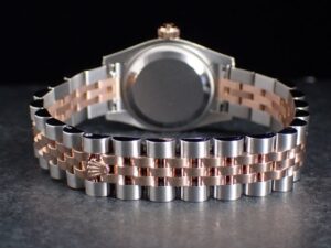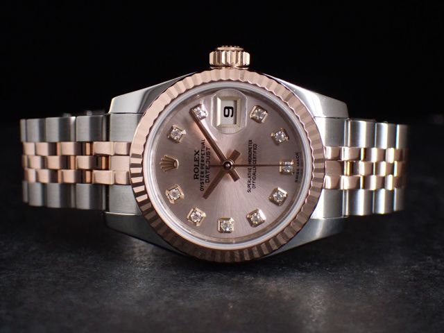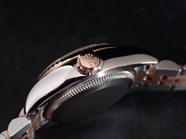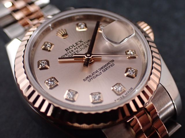 本日はROLEX DATEJUST【Ref.179171G】をご紹介いたします。こちらは2014年製ケース径26mmのレディース・デイトジャストです。可愛らしいピンク文字盤には、華やかな10ポイントダイヤモンドがセッティングされており、18Kピンクゴールドとステンレススチールのコンビネーションモデルの中でも、特に人気の高いダイアルカラーとなっております。イエローゴールドのコンビモデルに比べて主張が強すぎず、全体的にやわらかく上品な印象を演出してくれる一本です。現行の28mmモデルよりケース径が約2mm小さいため、腕回りの細い女性の方にもバランス良くお使いいただけます。お電話やメールにて【試着予約】も承っております。ご興味をお持ちの方やご検討中の方は、ぜひお気軽にクォーク銀座店までお問い合わせくださいませ。