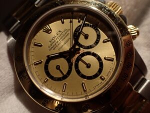 本日はROLEX DAYTONA【Ref.16523】をご紹介いたします。1988年から2000年まで生産されておりました5桁デイトナ。こちらは歴代としては初のコンビモデルのRef.16523。普段使いしやすいステンレス素材と高級感を演出してくれるイエローゴールドの組み合わせ。5桁モデルが故にどこか無骨さも兼ねそろえておりカッコ良く感じます。さらにはこちらは初期の通称「段落ち」、または「フローティング」文字盤とも呼ばれます。長短針の黒いラインが細いオリジナルの針も本当に貴重です。お電話やメールにて【試着予約】も承っております。ご興味をお持ちの方やご検討中の方は、ぜひお気軽にクォーク銀座店までお問い合わせくださいませ。