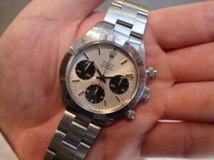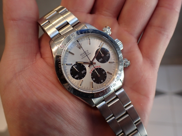 本日はROLEX DAYTONA【Ref.6265】をご紹介いたします。こちらの個体にはMK2ベゼル、MK3プッシャーが装着されており、文字盤には細かい傷が見られますが、夜光落ちの無い良い後期ダイアルとなります。ケースには僅かにポリッシュ感はございますが、保証書付きのRef.6265は入荷数も少なく大変オススメのモデルでございます。お電話やメールにて【試着予約】も承っております。ご興味をお持ちの方やご検討中の方は、ぜひお気軽にクォーク銀座店までお問い合わせくださいませ。