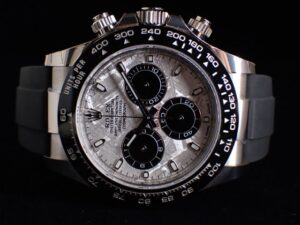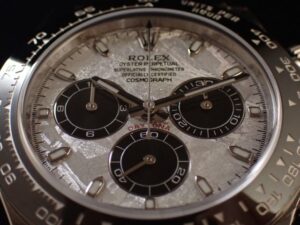 本日はROLEX DAYTONA【Ref.116519LN】をご紹介いたします。高級スポーツウォッチの中でも特別な存在感を放つ、デイトナのメテオライト文字盤モデルです。ホワイトゴールドケースに、一本一本が唯一無二の模様を持つ隕石ダイヤルを組み合わせた、非常に希少性の高い一本で、コレクターの間でも高い人気を誇ります。