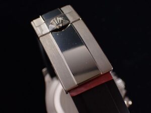 現行モデルRef.126519LNの細長いブラック枠のインデックスに対し、本モデルは丸みのあるシルバーフチのインデックスを採用しており、メテオライト文字盤と美しく調和している点も魅力です。さらに、製造期間が2021年から2023年までの約2年間と短いこともあり、その希少性の高さも人気の理由の一つとなっています。中古商品ではございますが、一部出荷時のシールが残っている点もおすすめのポイントです。