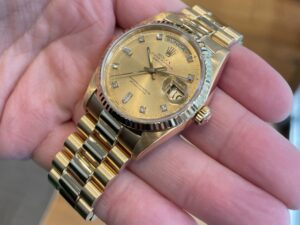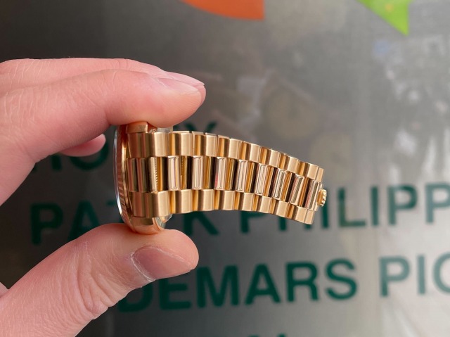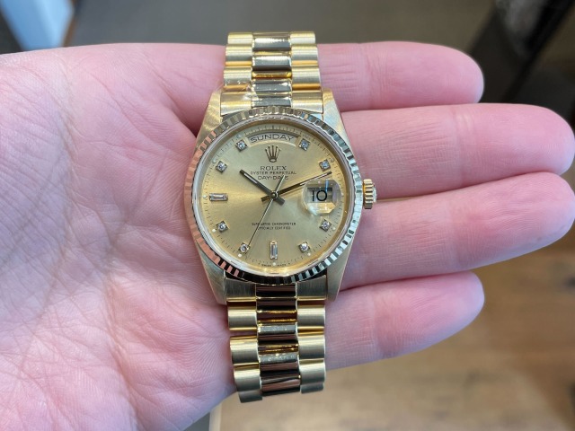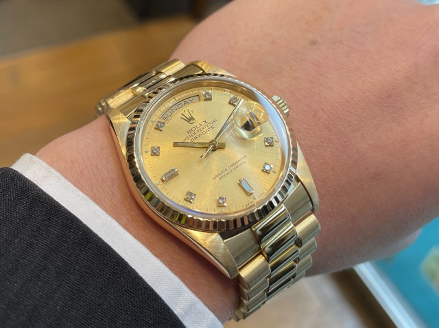 本日はROLEX DAYDATE【Ref.18238A】をご紹介いたします。金無垢のみの生産となるドレスウォッチ最高峰モデル【デイデイト】。イエローゴールドを贅沢に使用したデザインが他のモデルとは一線を画すラグジュアリーな雰囲気を放っています。搭載されたCal.3155は、日付表示に加えて曜日表示のクイックチェンジが可能となり実用性の面でも大きな進化を遂げました。高級感はもちろん、実用性の兼ね備えた1本いかがでしょうか。お電話やメールにて【試着予約】も承っております。ご興味をお持ちの方やご検討中の方は、ぜひお気軽にクォーク銀座店までお問い合わせくださいませ。 |
