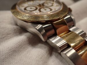 本日はROLEX DAYTONA【Ref.16523】をご紹介いたします。1988年から2000年まで生産されておりました5桁デイトナ。こちらは歴代としては初のコンビモデルのRef.16523。普段使いしやすいステンレス素材と高級感を演出してくれるイエローゴールドの組み合わせ。5桁モデルが故にどこか無骨さも兼ねそろえており、この「ならではの雰囲気」がカッコ良く感じます。こちらの個体はケース・ベゼル・ブレスレットのコンディションが非常に良く、さらに18Kの部分が所々金灼けしておりまして、ヴィンテージの雰囲気が出てきております。価格面もお手頃価格でございますので是非オススメです!お電話やメールにて【試着予約】も承っております。ご興味をお持ちの方やご検討中の方は、ぜひお気軽にクォーク銀座店までお問い合わせくださいませ。 |
